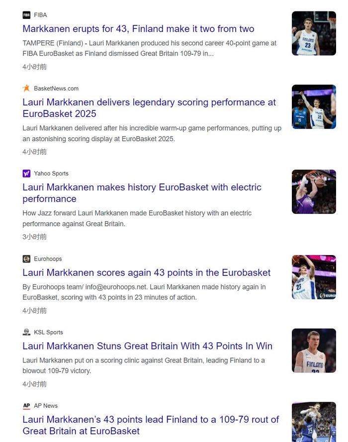 劳里-马尔卡宁将欧洲杯正赛打成了热身赛?此前芬兰男篮打了四场热身赛,马卡三场拿到30+且两场40+,三场热身赛场均40.5分,没想到在欧洲杯正赛上他也可以拿40+,对阵英国一战23分钟他就拿到43分。