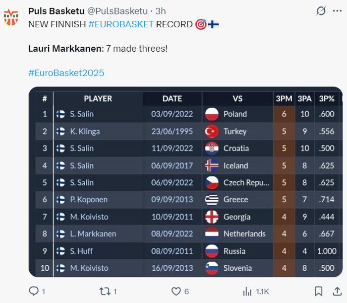 7.马卡欧洲杯单场7个三分球也是芬兰队史新高;