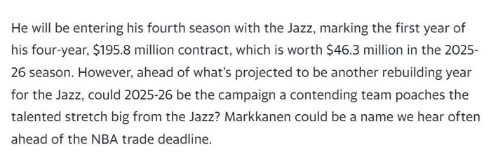 《雅虎体育》的评论:马卡将开启他在爵士的第四个赛季,这也是他四年合同的第一年,25-26赛季价值4630万,重建的爵士队可能会被其他球队挖走这位天赋异禀的大个子,在下赛季的交易截止日之前,我们可能会经常看到他的名字。