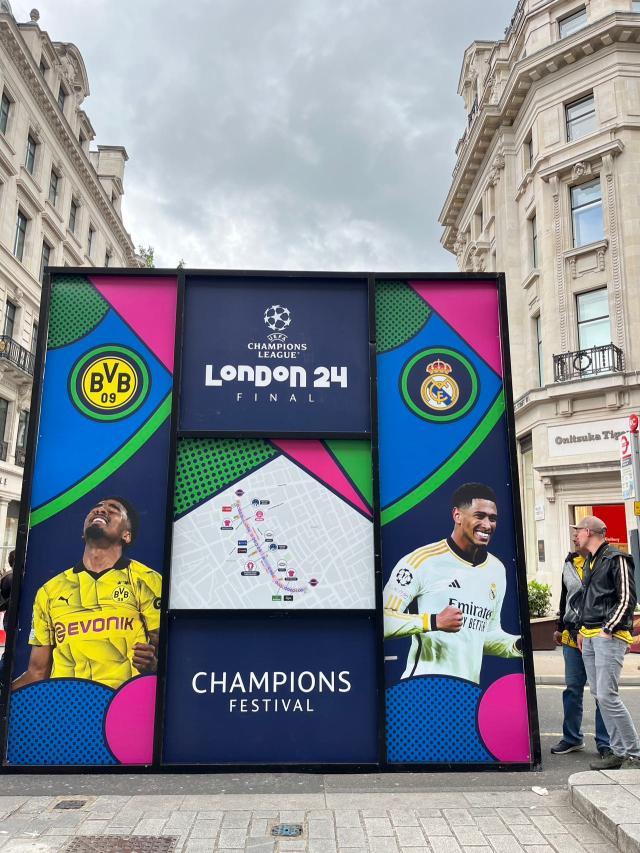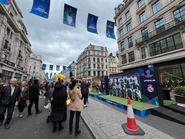 和冷清的温布利相比,当天伦敦的热闹之处其实在市中心的摄政街上。这条伦敦最为宽敞气派的大街当天彻底封路,写有“伦敦 24 决赛”的拱门在摄政街两侧的出入口处竖起,路中央搭建了一座临时舞台,背景屏幕上播放着两队晋级决赛的进球集锦,舞台上定时会有美声合唱,将欧冠主题曲的旋律放送到隔壁的牛津街和皮卡迪利广场,以吸引更多人气。这里沿街除了赞助商的各种体验活动之外,欧足联还在这里露天搭建了数处可供打卡拍照的景点,既有两队的巨型球衣展示,还有模拟新闻发布会的场景,吸引了一众行人围观拍照。不过,这里吸引的主要还是那些原本就要来此购物的游人。你甚至会听到排队拍照的人群里有人迷惑地询问同伴:“这两支球队下个月还会去德国参加欧洲杯么?”